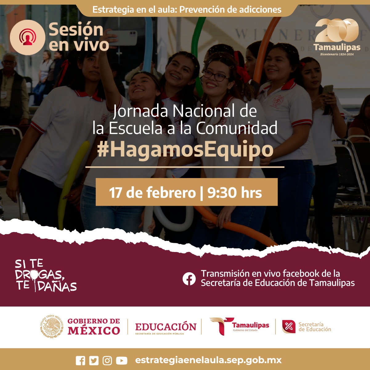 Ciudad Victoria, Tamaulipas.– Con la participación de alumnas y alumnos de educación secundaria y bachillerato, se efectuará este sábado 17 de febrero la Jornada Nacional De la Escuela a la Comunidad #HagamosEquipo, en el Gimnasio Multidisciplinario de la Universidad Autónoma de Tamaulipas de ciudad Victoria.