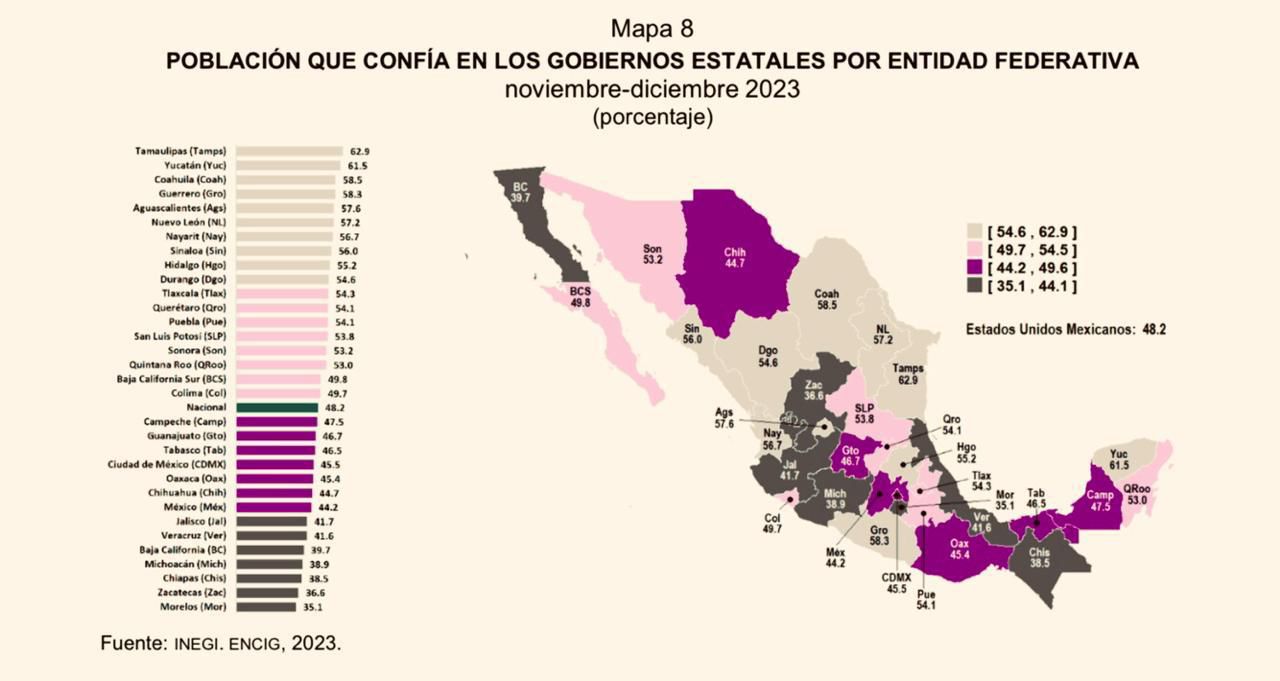 A nivel nacional la confianza en las instituciones – gobiernos estatales, señala que el 48.2 % de la población de 18 años y más en áreas urbanas confiaba en los gobiernos estatales.
