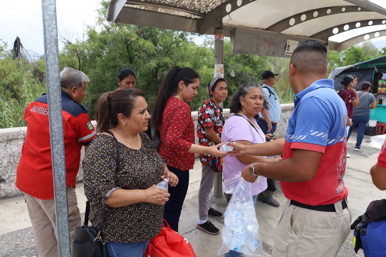 Paramédicos y personal de bomberos recorrieron del 6 al 8 boulevard Praxedis Balboa para ofrecer raciones de agua fresca a niños, jóvenes y adultos para evitar afectación en su salud por los 41 grados centígrados, con sensación térmica de 43, que registran en la Capital del Estado.