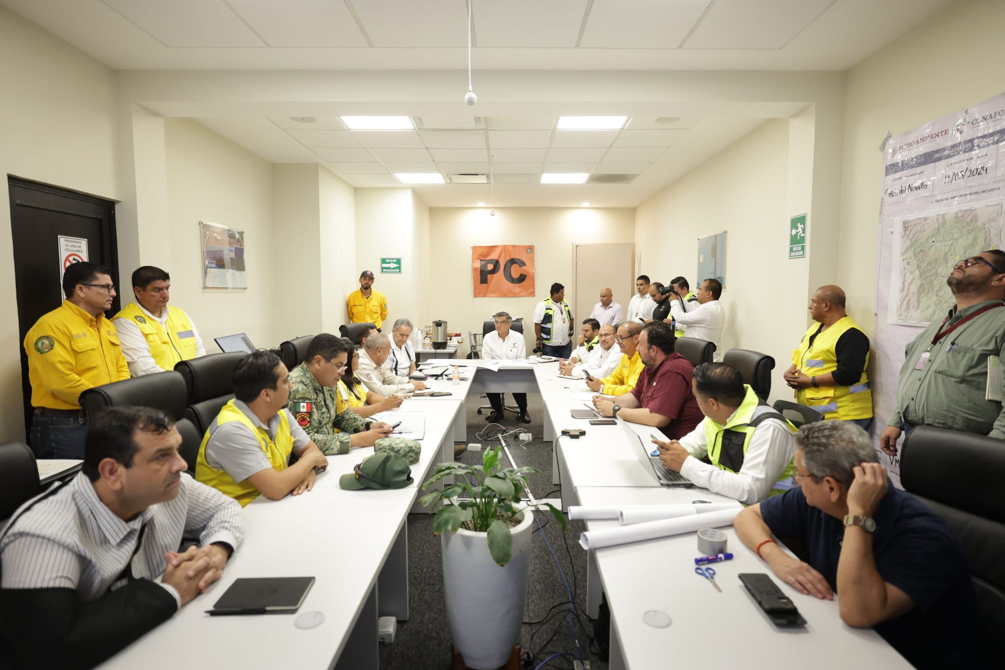 En la reunión, el gobernador hizo un reconocimiento y destacó la colaboración de los pobladores de las comunidades ejidales afectadas que se han sumado de manera voluntaria a las tareas de combate al incendio.