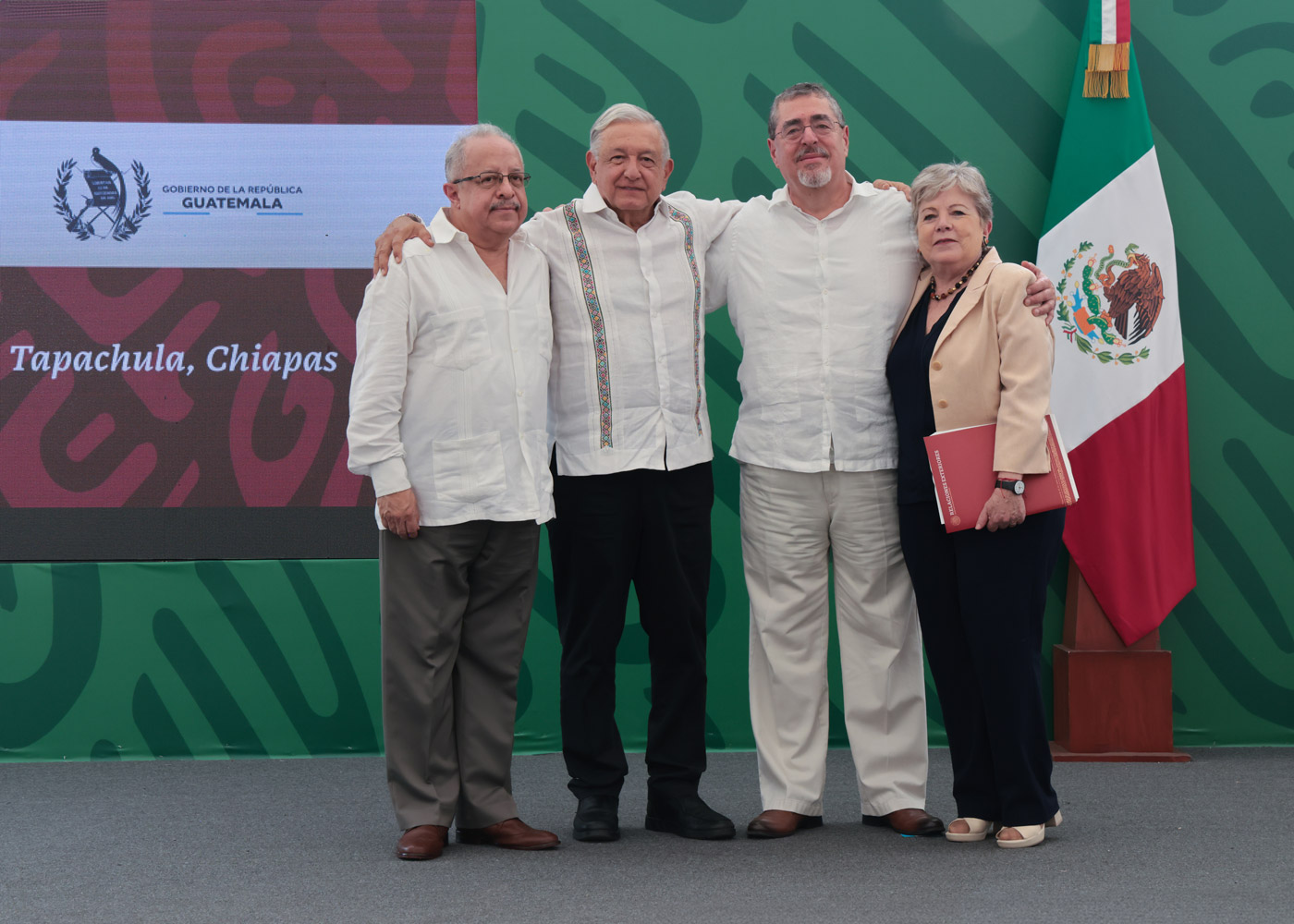 Por parte del Gobierno de Guatemala asistieron: el ministro de Gobernación, Francisco Jiménez Irungaray; el ministro de Relaciones Exteriores, Carlos Ramiro Martínez Alvarado; el ministro de la Defensa Nacional, Henry David Saenz Ramos; el ministro de Energía y Minas, Víctor Hugo Ventura Ruíz; el titular de la Secretaría de Inteligencia Estratégica del Estado, Christian Esaú Espinoza Sandoval; el embajador de Guatemala en México, Marco Tulio Chicas Sosa; el viceministro de Relaciones Exteriores, Eduardo Antonio Escobedo Sanabria; la secretaria ejecutiva de la Coordinadora Nacional para la Reducción de Desastres, Claudinne Ogaldes Cruz; el director general del Instituto Guatemalteco de Migración, Alfredo Danilo Rivera; el superintendente de la Administración Tributaria, Marco Livio Díaz Reyes; la gobernadora departamental de Huehuetenango, Elsa Hernández Méndez; el gobernador departamental de San Marcos, Rolando López Crisóstomo y el gobernador departamental de Petén, Mauricio José Acevedo Sandoval.
