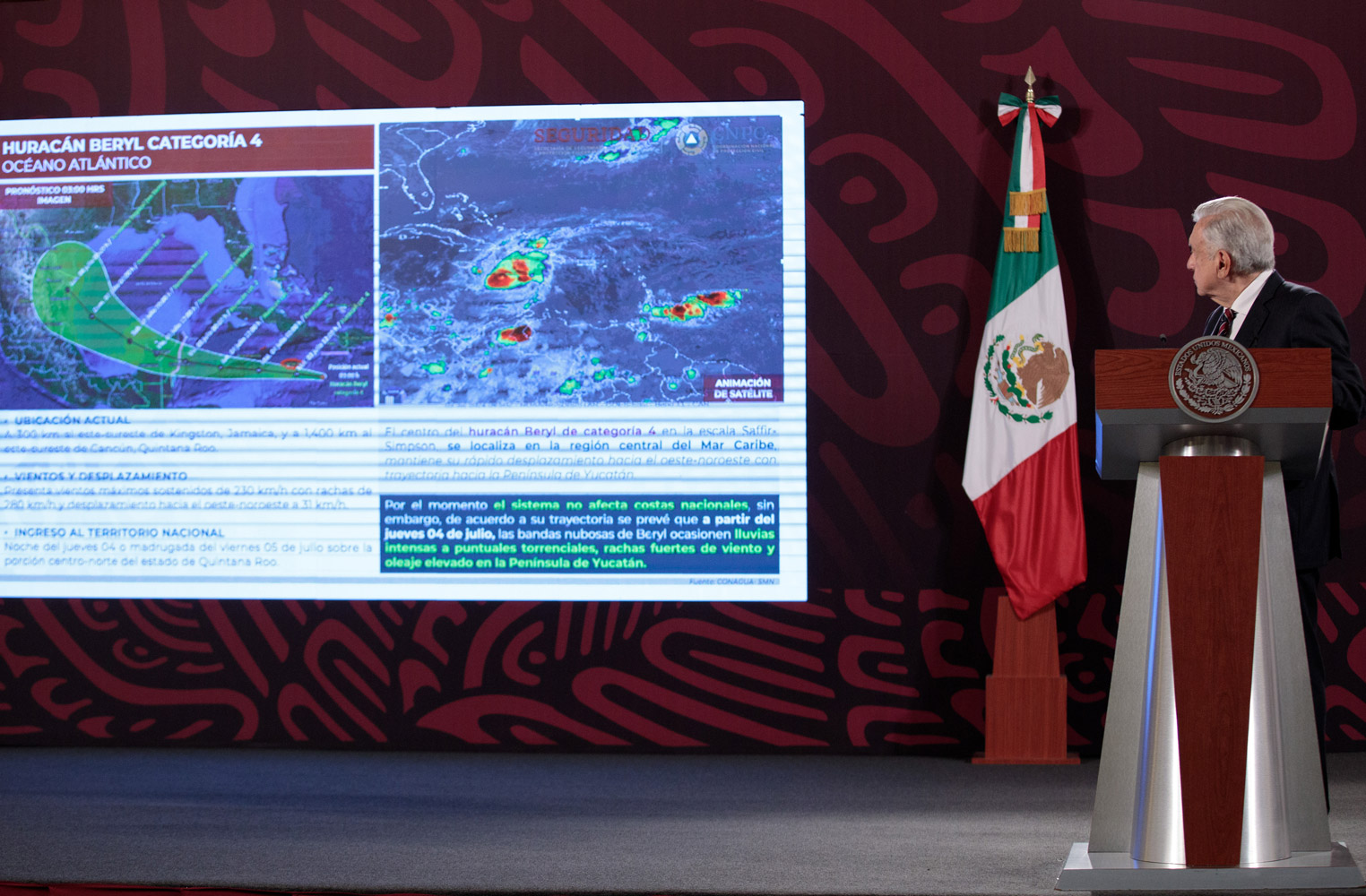 La coordinadora de Protección Civil expuso al presidente Andrés Manuel López Obrador y representantes de los medios de comunicación que Beryl se encuentra en la región central del mar Caribe. Se prevé que impacte la noche del jueves 4 de julio o la madrugada del viernes 5 de julio entre los municipios de Tulum y Felipe Carrillo Puerto.