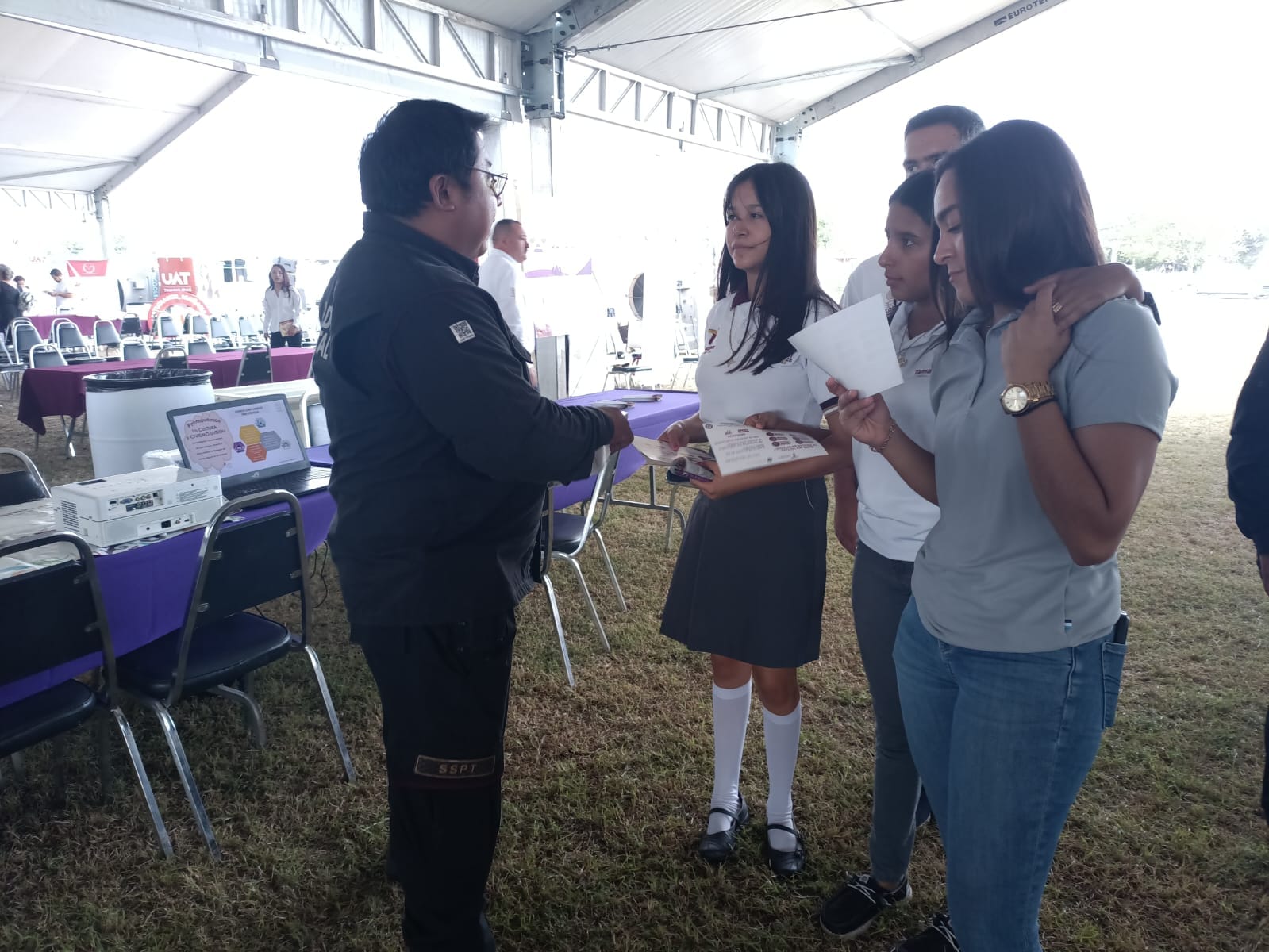 Cruillas, Tamaulipas.- Durante la brigada del Sistema DIF Tamaulipas, “Transformando Familias”, celebrada en la Unidad Deportiva del municipio de Cruillas, personal de la Guardia Estatal Cibernética mantuvo la proximidad con la población y promovió el civismo digital entre las familias asistentes.
