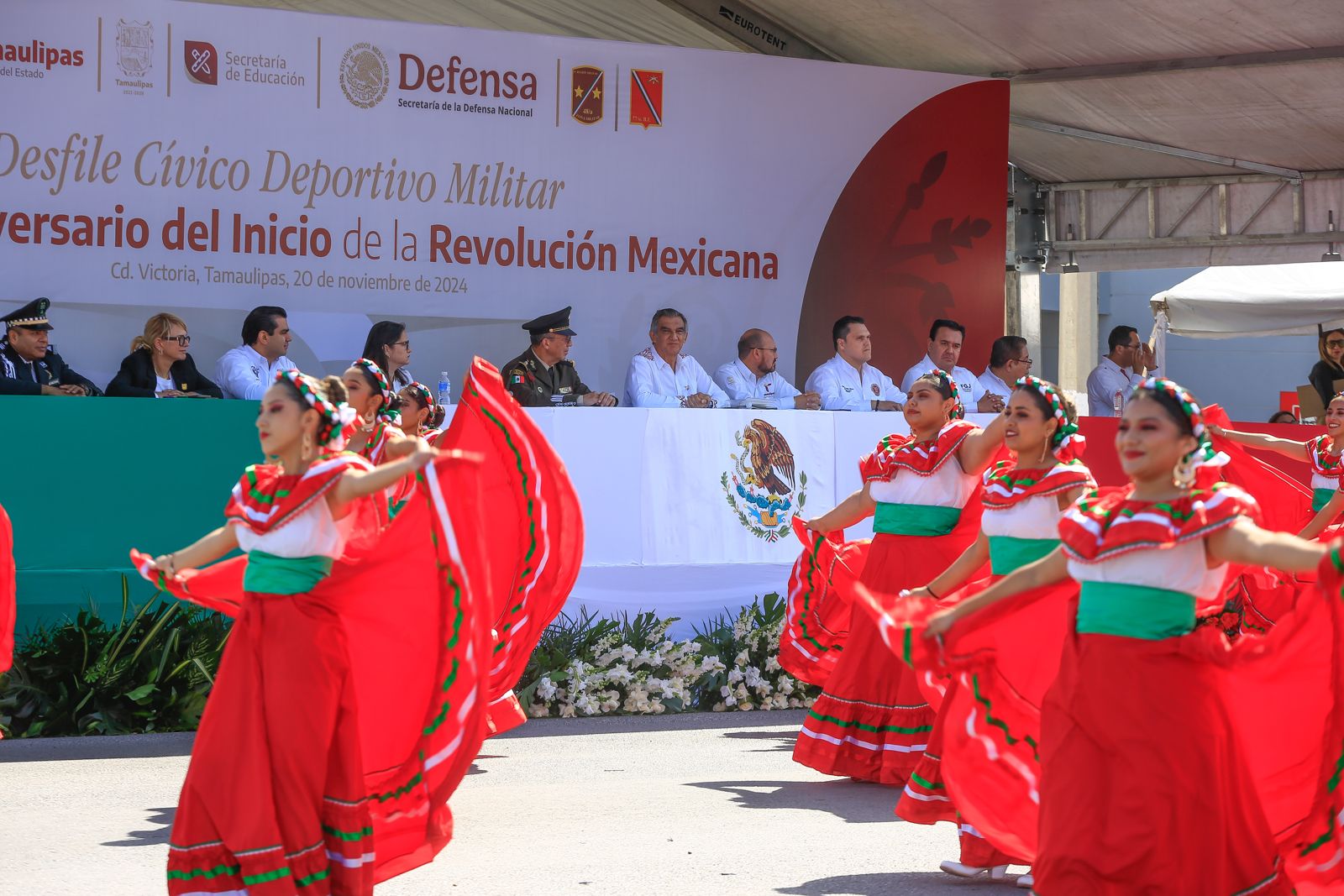 Acompañado por el general DEM Enrique García Jaramillo, comandante de la 48ª Zona Militar, el gobernador Américo Villarreal atestiguó, por espacio de casi cuatro horas, el paso de los contingentes llenos de colorido, música tradicional mexicana y atuendos revolucionarios, todos ejecutando sus rutinas, tablas gimnásticas, pirámides monumentales y evoluciones ante el aplauso de los miles de familias congregadas a lo largo del bulevar Tamaulipas, de esta capital.