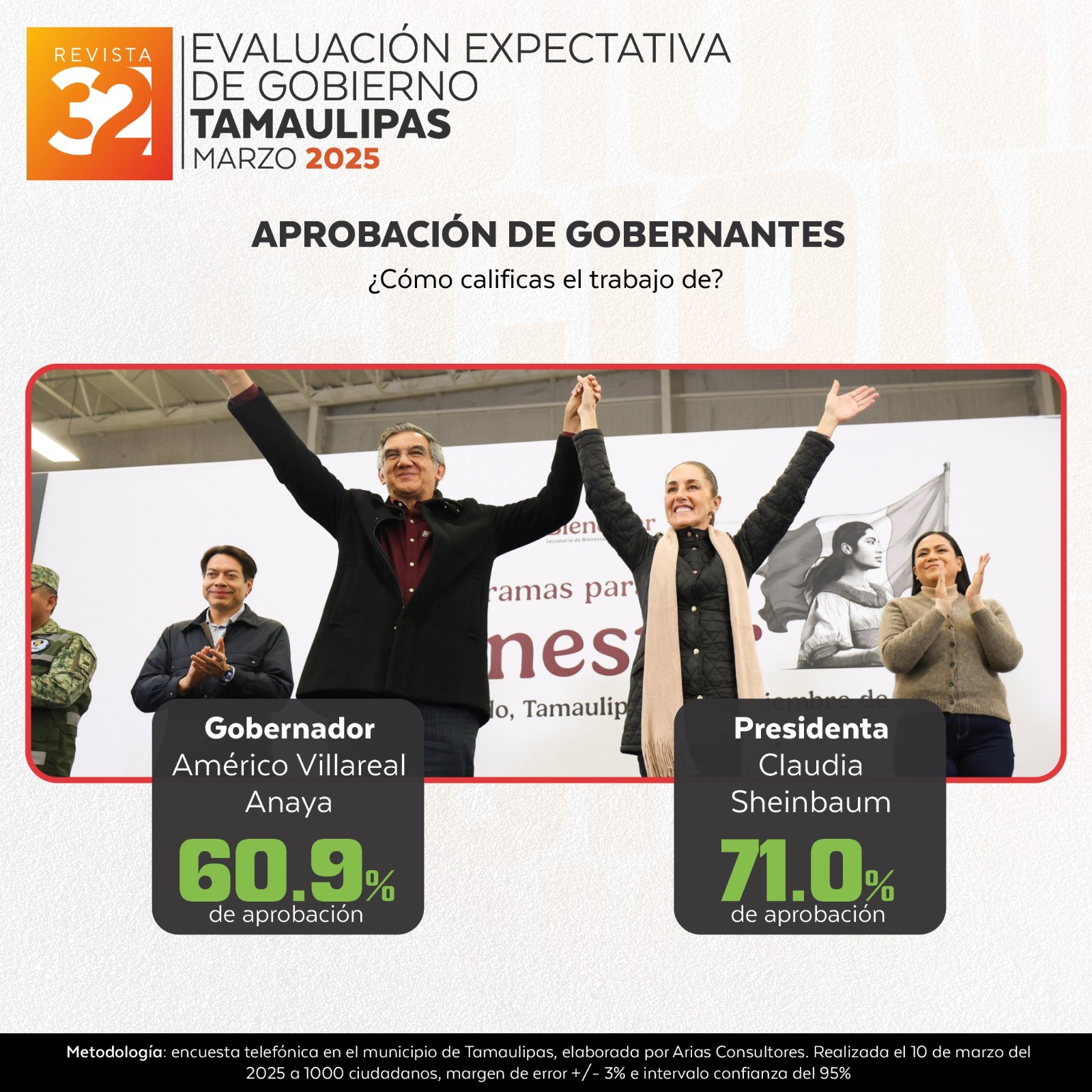 Estos resultados reflejan un respaldo mayoritario a la gestión del gobernador Américo Villarreal. Los resultados de esta encuesta están publicados en el sitio web de Arias Consultores.