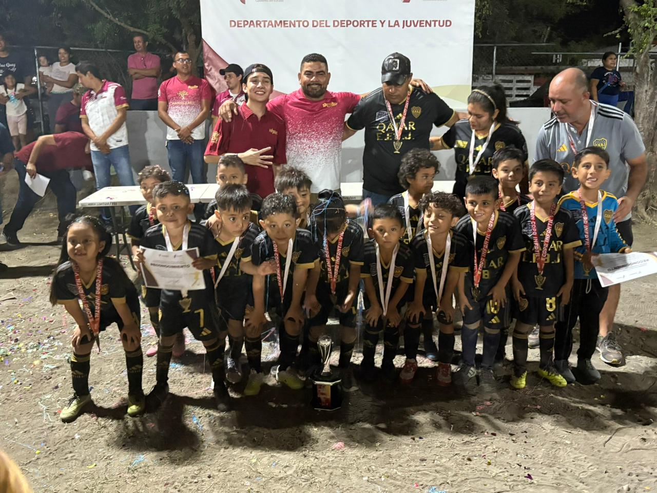 Cd. Victoria. – En representación del alcalde Eduardo Abraham Gattás Báez, el Delegado del Instituto Victorense de la Juventud (IVJUVE), Abraham Gattás Rodríguez y Carlos Pizaña jefe del Deporte local, encabezaron la premiación a los campeones de la primera edición del torneo de fútbol infantil y juvenil Copa Victoria Municipal 2025.