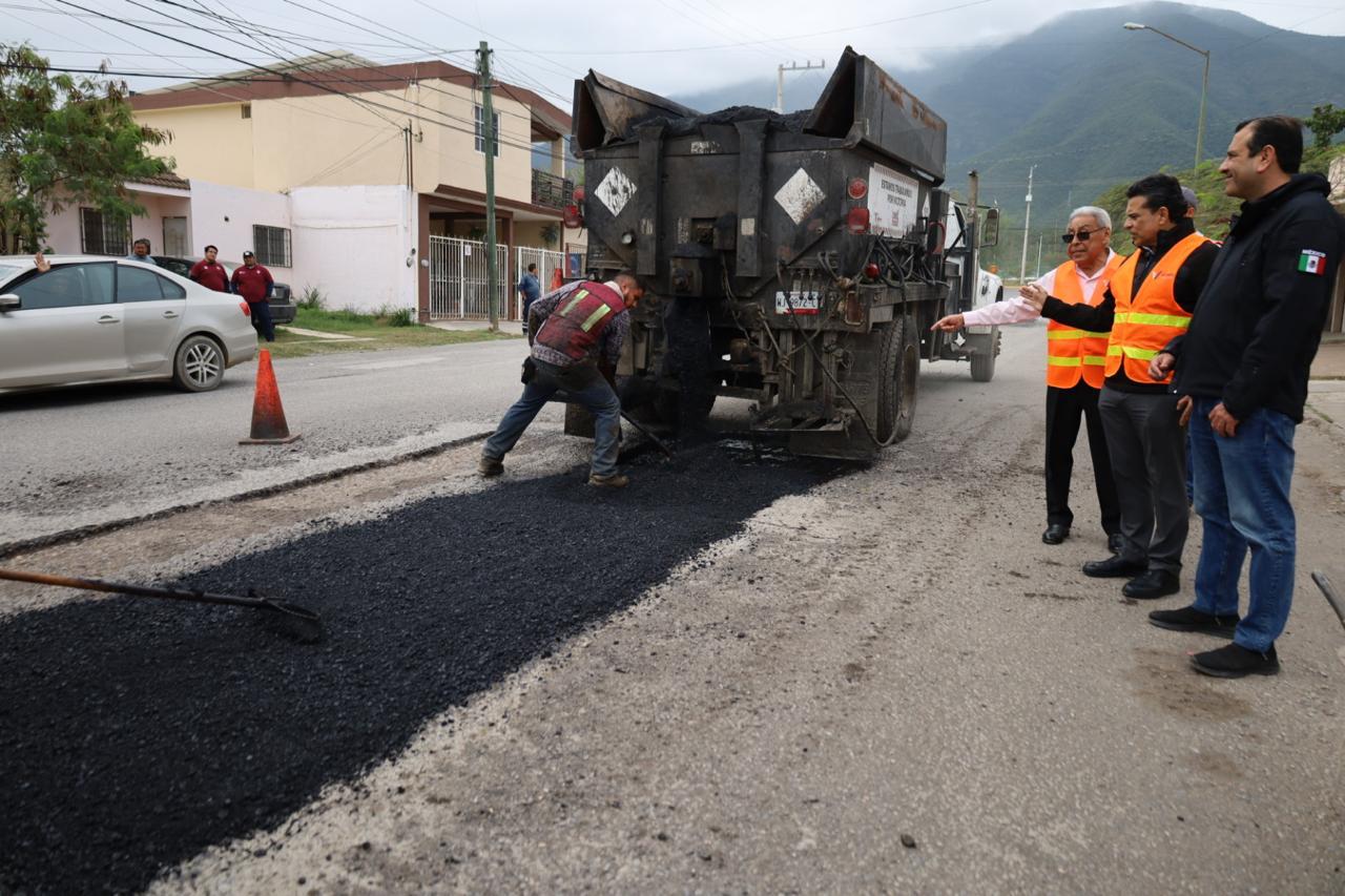 En compañía de los secretarios de Obras Públicas del Municipio, Eusebio Alfaro Reyna, y del Ayuntamiento, Hugo Reséndez Silva, verificaron el proceso de reparación y calidad de restauración de la carpeta asfáltica dañada por el constante tráfico vehicular y lluvias.