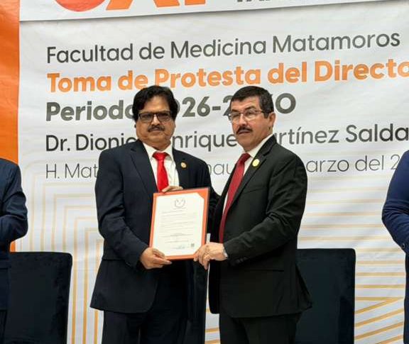 El rector de la Universidad Autónoma de Tamaulipas (UAT), Dámaso Anaya Alvarado, encabezó la toma de protesta del Dr. Dionisio Enrique Martínez Saldaña como director de la Facultad de Medicina Matamoros para el periodo 2026-2030.